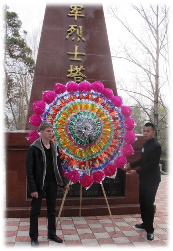 Молодые люди возложили венки и белые цветы, сделанные руками китайских студентов из тонкой рисовой, к памятнику российским и китайским воинам, погибшим в годы Второй мировой войны (парк Ван Су).