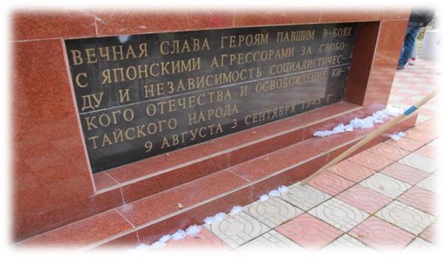 Дальневосточники, как и все советские люди, с первых военных дней всеми делами и помыслами были там, где решалась судьба нашей Родины. Япония стала подтягивать войска к Амурской границе, но бойцы 396 Хинганской стрелковой дивизии не дали возможности осуществить замыслы. Ценой своей жизни они освободили китайский народ от японских захватчиков. Китайский народ не забыл наших героев, поэтому на памятнике написано: «Вечная слава героям, павшим в боях с японскими агрессорами за свободу и независимость социалистического Отечества и освобождение китайского народа». Китайский народ не забыл, и мы не забудем отвагу и мужество наших солдат.