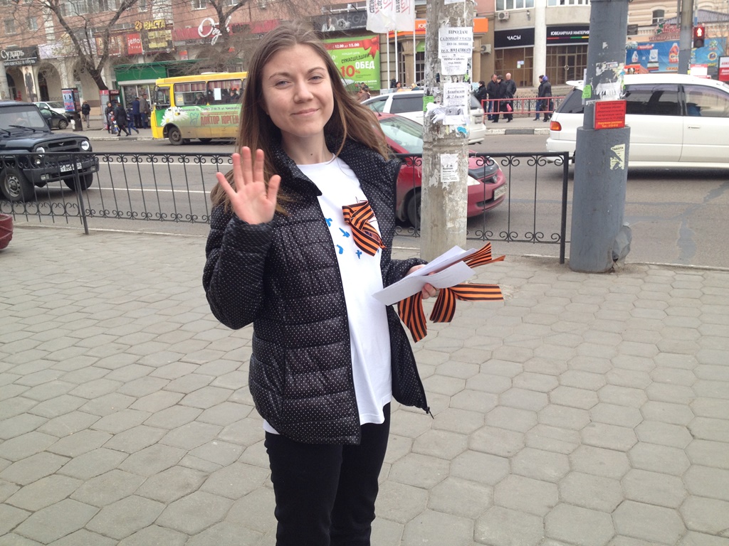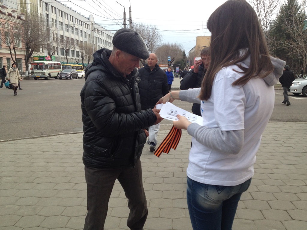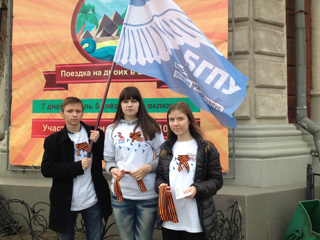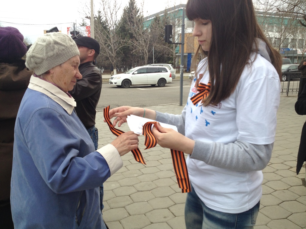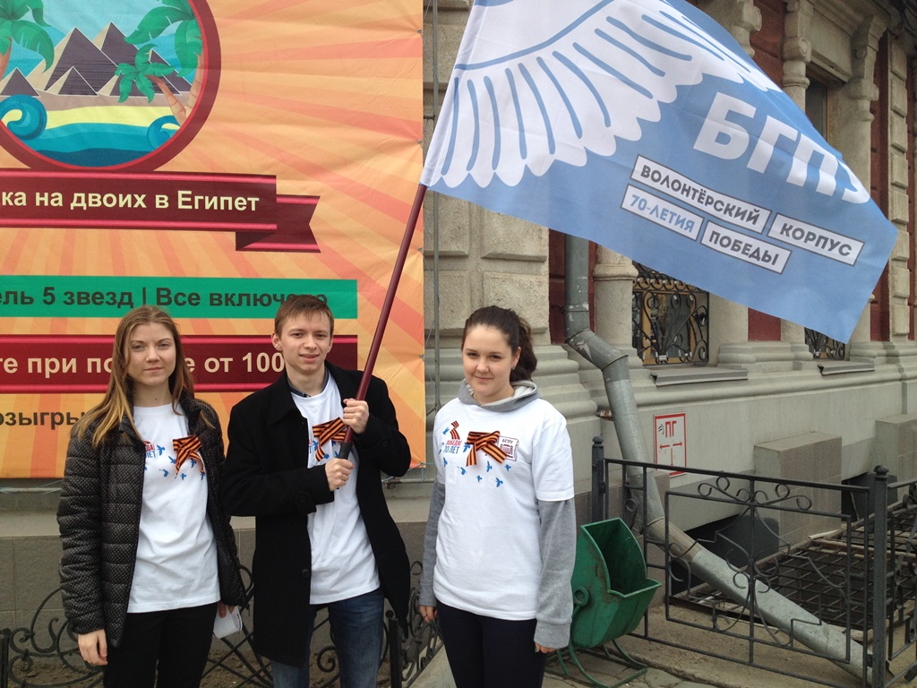 Сегодня более 300 граждан г. Благовещенска получили из рук волонтеров БГПУ традиционные ленточки и прикололи их на грудь в знак памяти и признательности героям войны. Волонтеры не только предлагали повязать георгиевскую ленточку, но рассказывали историю возникновения акции, а также как правильно повязать ленту, где не допускается ношение символа Победы. Вместе с лентами предлагали и памятки. Акция была проведена волонтерами БГПУ в трех районах г. Благовещенска, во всех корпусах университета.