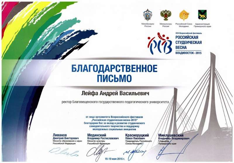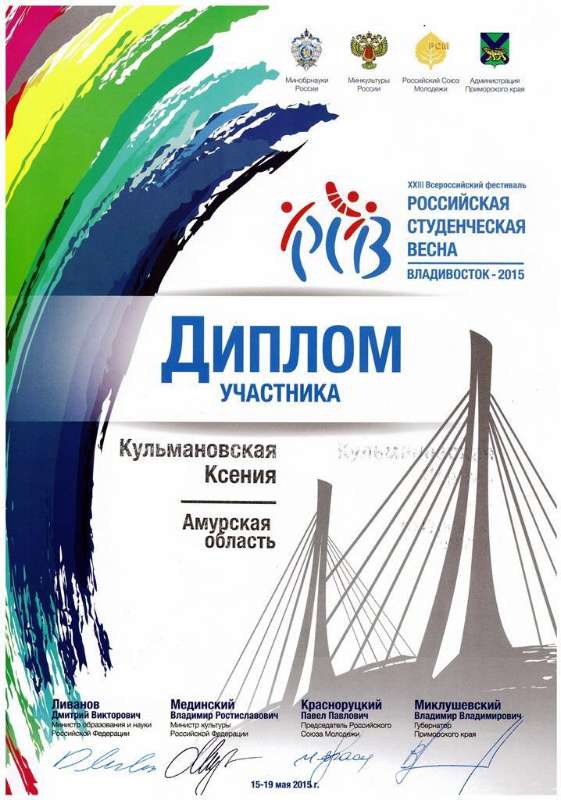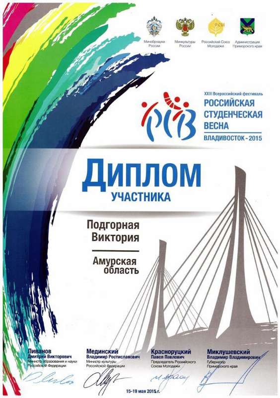 С 15 по 19 мая во Владивостоке проходил фестиваль "Всероссийская студенческая весна". БГПУ представляли Ксения Кульмановская, студентка историко-филологического факультета, и Виктория Подгорная, студентка факультета иностранных языков.
