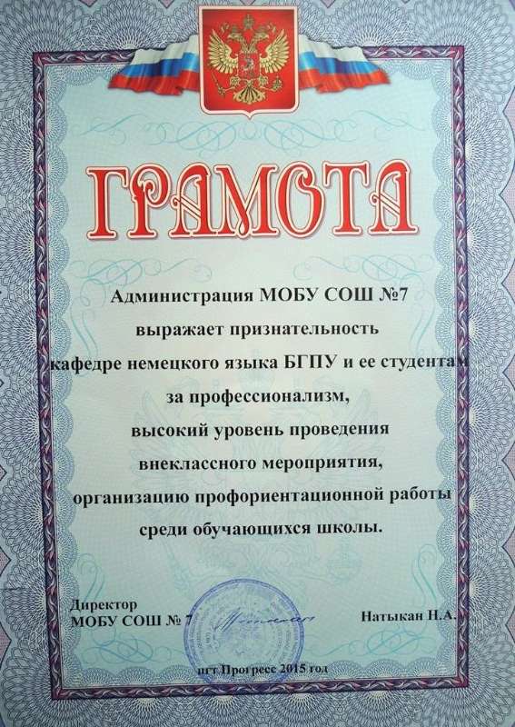 Преподаватели и студенты, а также лектор Фонда им. Роберта Боша Элли Макк посетили МОБУ СОШ № 7 пгт. Прогресс, где устроили настоящий праздник немецкого языка. На подготовленном студентами мероприятии присутствовали школьники, изучающие не только немецкий, но и английский язык. Сначала робко, а потом все активнее и активнее они реагировали на вопросы ведущих и наблюдали за происходящим на импровизированной сцене.