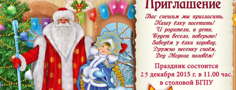 25 декабря в 11.00 ч. в столовой БГПУ состоится Новогоднее представление для детей сотрудников и преподавателей БГПУ. Дополнительная информация в профкоме (ауд. 103/1Б; тел. (4162) 77-16-85)