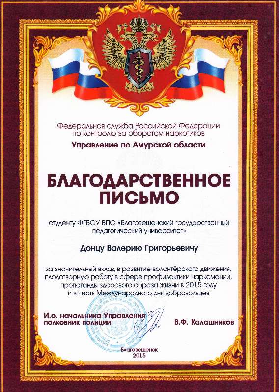 Международного дня добровольца от и.о. начальника Управления ФСКН по Амурской