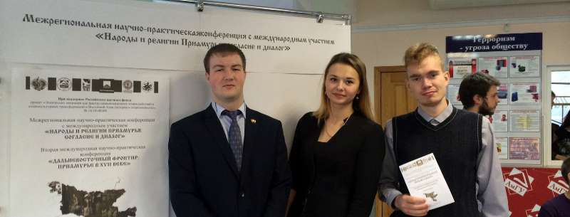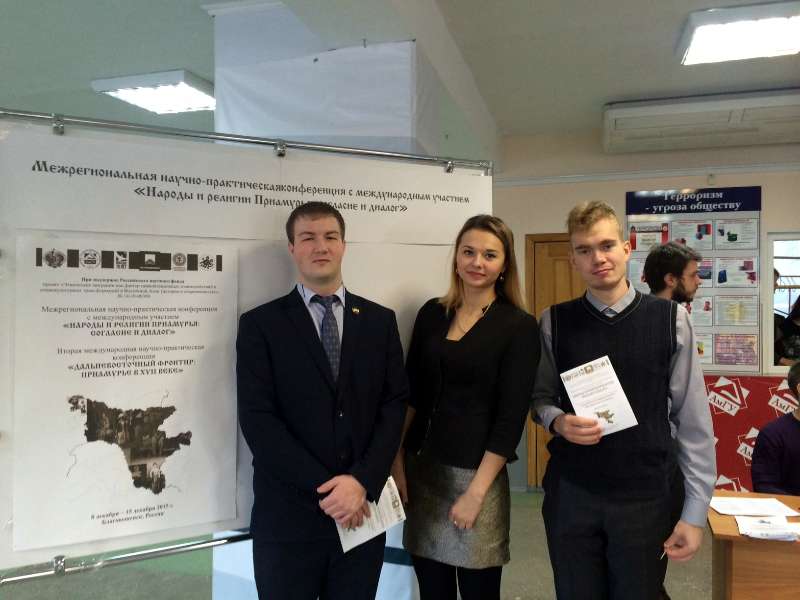 Студенты историко-филологического факультета БГПУ Григорий Эзри, Татьяна Канцедалова и Алексей Мусиенко приняли участие в Межрегиональной научно-практической конференции с международным участием "Народы и религии Приамурья: согласие и диалог", а также в дискуссионной площадке на тему: "Формирование межкофессионального и межнационального диалога в молодежной среде" (модератор площадки - Нудьга М.В., начальник отдела по молодежной политики Министерства внутренней информационной политики Амурской области и Е.А. Лунькова, член Общественной палаты Амурской области).