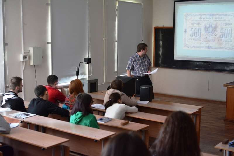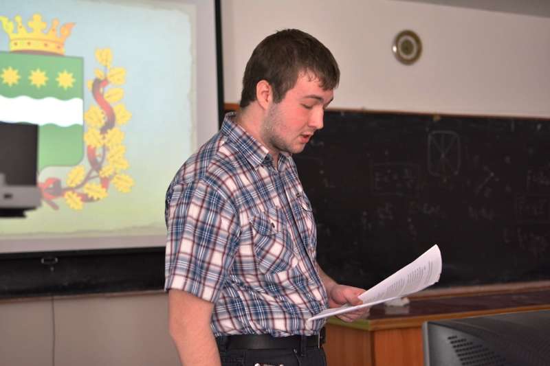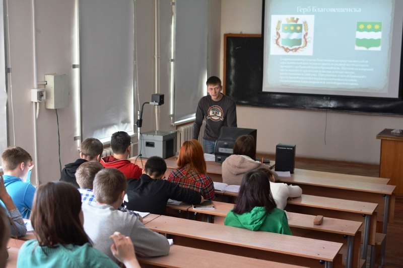 Студенты-историки выступили с докладами. Алексей Мусиенко, обучающийся на 3 курсе, рассказал о геральдике Амурской области, а второкурсник Максим Максимович - о геральдике города Благовещенска.