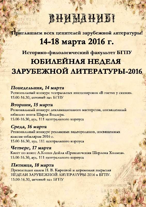 Новостная лентаНеделя зарубежной литературы - 201611 Марта 2016 С 14 по 18 марта в БГПУ будет проходить юбилейная V Неделя зарубежной литературы. Более двухсот заявок на участие в НЗЛ-2016 поступило от курсантов ДВОККУ, студентов Донского госуниверситета, БГПУ, АмГУ, Финуниверситета, Амурского колледжа искусств и культуры, Благовещенского политехнического колледжа, а также школьников Шимановска, Талакана, Благовещенска. Самые маленькие участники – первоклассники. Все мероприятия недели – конкурсы инсценировок, декламационного мастерства, эссе, видеороликов - посвящены юбилеям известных книг и знаменитых на весь мир писателей. Многие конкурсы НЗЛ стали уже традиционными, они проводятся каждый год. И каждый год появляется что-то новое. Так, в 2016 г. впервые к участию в неделе допущены не только студенты и школьники, но и взрослые, приславшие свои работы на конкурсы эссе и видеороликов. Еще одно новое событие – в программу НЗЛ-2016 включен квест по книге А. Конан Дойла «Приключения Шерлока Холмса». А еще впервые конкурс эссе будет оценивать не только профессиональное жюри, но и самая широкая читательская аудитория. За 1 из 30 вышедших во второй тур эссе можно проголосовать: участник 1-10; участник 11-20; участник 21-30. Голосование проходит до 8 утра 17 марта. Хроника мероприятий: В понедельник 14 марта в актовом зале БГПУ на открытии Недели участников и зрителей встретят Шерлок Холмс, Доктор Ватсон и Миссис Хадсон, которые проведут конкурс театральных инсценировок по сказкам В. Гауфа, братьев Гримм, Дж. Родари и А. Милна. Постановки представят на русском и немецком языках студенты БГПУ и школьники. Во вторник 15 марта в ауд. 111 на конкурсе декламационного мастерства прозвучат стихи юбиляра Шарля Бодлера – на французском, русском, украинском языках. Помимо исполнения стихов великого француза, участники прочитают собственные стихи о жизни и творчестве Бодлера. Среди участников – не только студенты и школьники-россияне, но и граждане Бурунди, Конго, Мали, Анголы. В среду 16 марта в ауд. 111 пройдет конкурс буктрейлеров по книгам «Приключения Тома Сойера», «Над пропастью во ржи», «Алиса в Зазеркалье». Ролики сняты выпускниками и студентами БГПУ, школьниками из Благовещенска и Талакана.. В четверг 17 марта более 50 участников – студентов и школьников - соберутся на квест по книге-юбиляру «Приключения Шерлока Холмса», который начнется в ауд. 111 и пройдет в центральном корпусе БГПУ. В пятницу 18 марта в актовом зале БГПУ пройдет Закрытие недели зарубежной литературы-2016. В этот день вниманию собравшихся будет представлена новая книга профессора кафедры русского языка и литературы БГПУ, организатора Недель зарубежной литературы Н.В. Киреевой, посвященная опыту проведения этих мероприятий и возможностям его использования в учебном процессе. После презентации книги «Предметная неделя по зарубежной литературе» будут объявлены итоги всех конкурсов и начнется церемония награждения победителей Недели зарубежной литературы. Все мероприятия будут начинаться в 15.00. ![]() Другие новости |