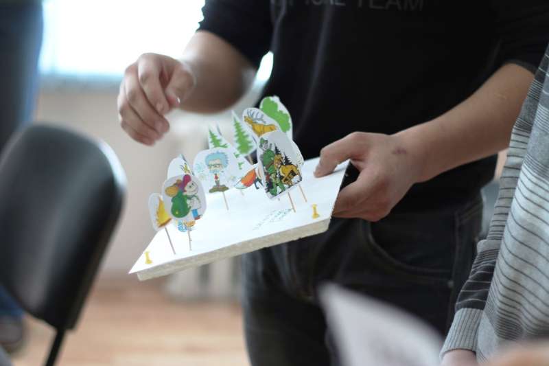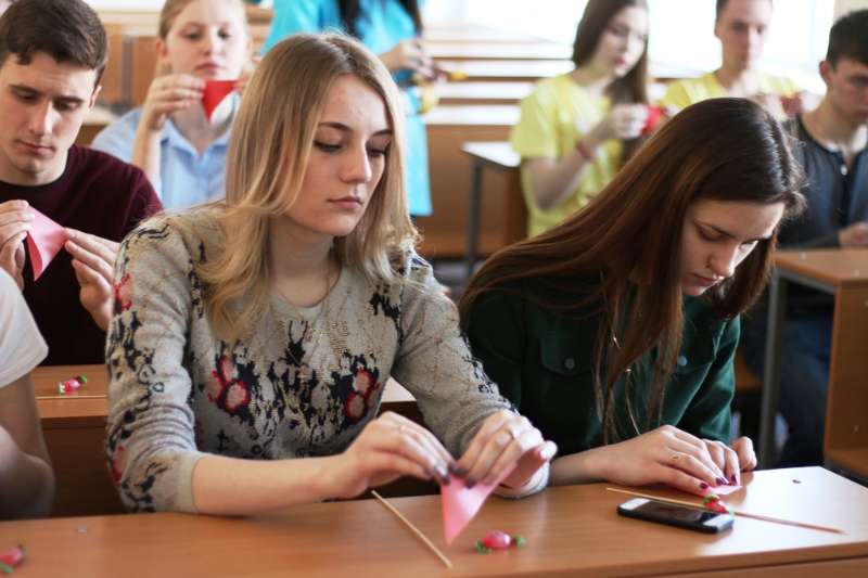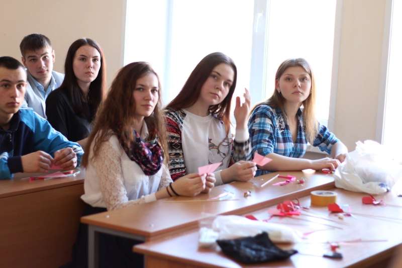 Презентация отряда «Мастера добра» проходила интересно и весело. Сначала студенты кратко рассказали о своей работе и показали фотографии с организованных мероприятий. И, так как учащиеся находились в мастерской добра, им было предложено сделать доброе дело – преподнести подарок соседу. Ребята изготовили сердца в технике оригами и подарили их своим новым друзьям, сказав добрые слова.
