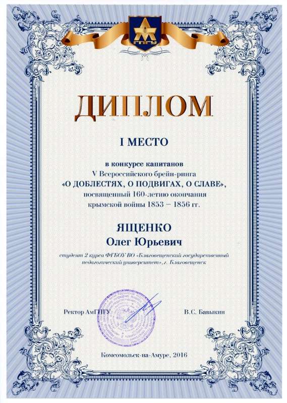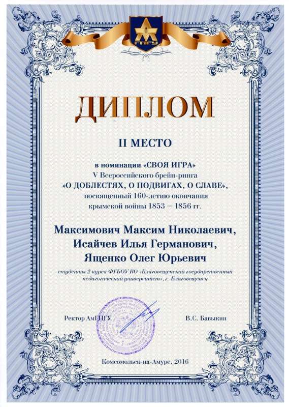 Олег Ященко, Максим Максимович и Илья Исайчев, студенты-историки 2 курса, приняли участие в V Всероссийском брейн-ринге «О доблестях, о подвигах, о славе», посвященном 160-летию окончания Крымской войны 1853-1856 гг.
