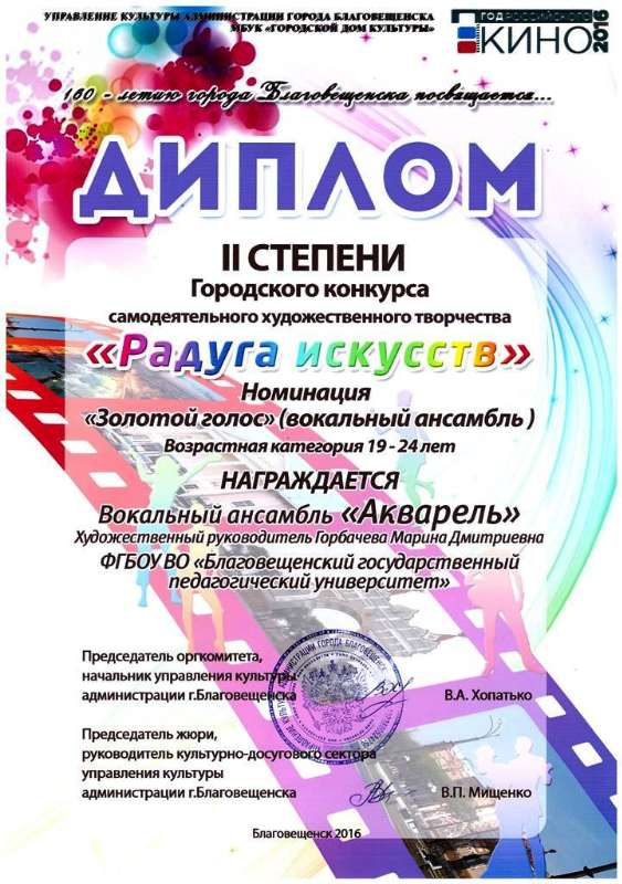 Диплом II степени в номинации "Золотой голос" (ансамбли) в возрастной категории 19-24 года получил вокальный ансамбль "Акварель" (ОДПП "Эстрадный вокал", руководитель - Марина Горбачёва).