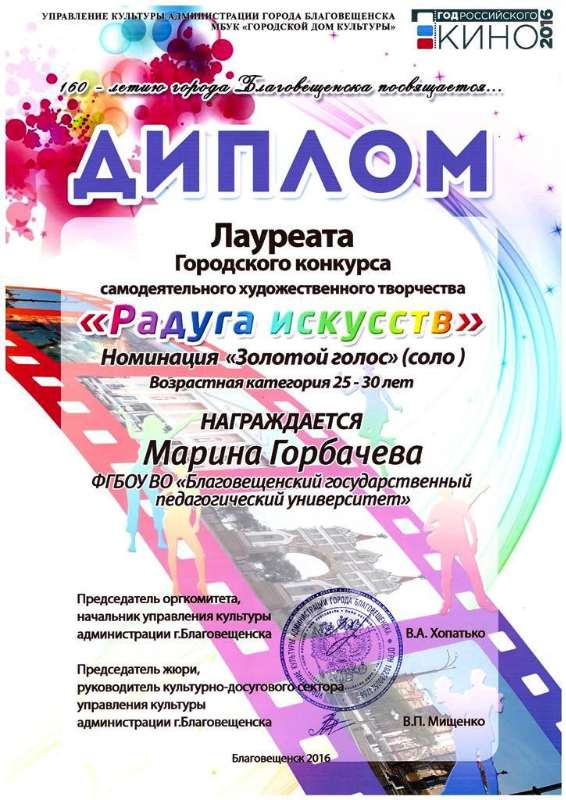 Дипломом Лауреата в номинации "Золотой голос" (соло) в возрастной категории 25-30 лет награждена Марина Горбачёва, руководитель ОДПП «Эстрадный вокал».
