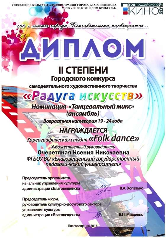 Хореографическая студия "Folk dance" (руководитель - Ксения Очеретяная) получила диплом II степени в номинации "Танцевальный микс" (ансамбли) в возрастной категории 19-24 года.