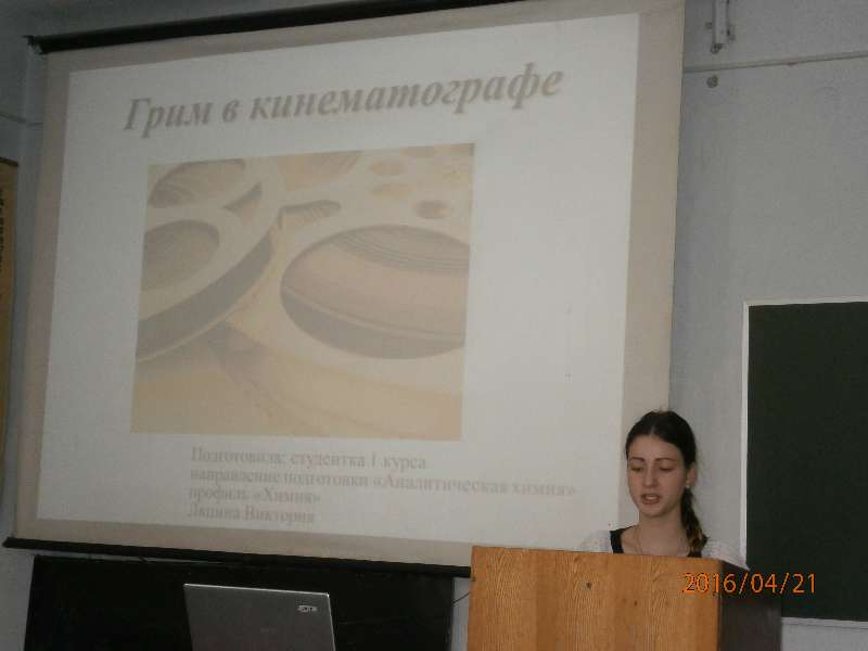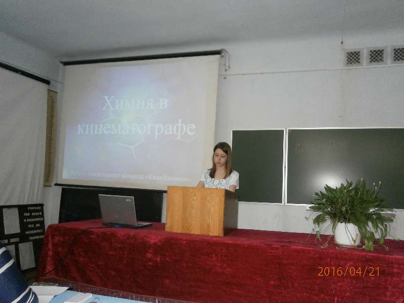 В четверг, 21 апреля, вниманию собравшихся были предоставлены доклады на тему «Химия и кинематограф». Все собравшиеся с большим интересом слушали выступающих. Докладчики рассказали о вкладе химиков в развитие кинематографа: изобретение и использование грима, различные спецэффекты: пожар, искусственный снег, туманы и т.д. Выступления сопровождались презентациями.