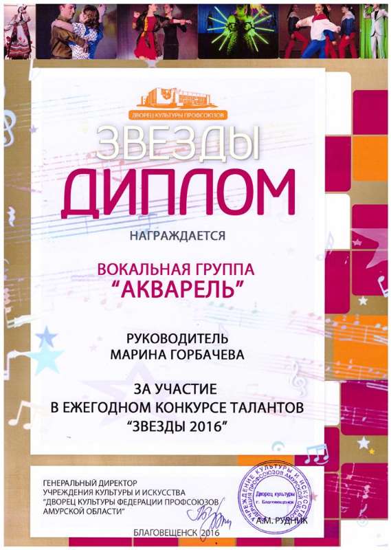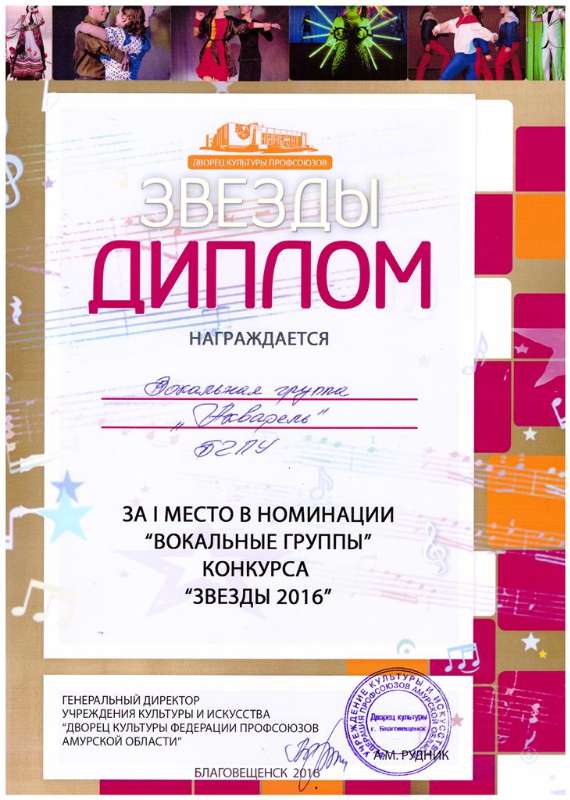 Вокальный ансамбль "Акварель" БГПУ (руководитель - Марина Горбачева) занял первое место в номинации "Вокальные группы" ежегодного конкурса талантов "Звезды 2016", который прошел в ДК Профсоюзов 22 апреля.