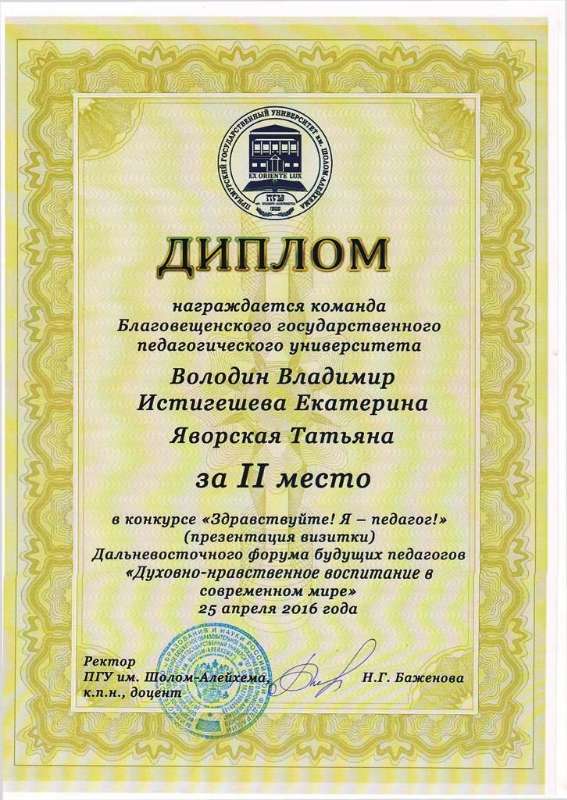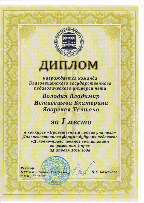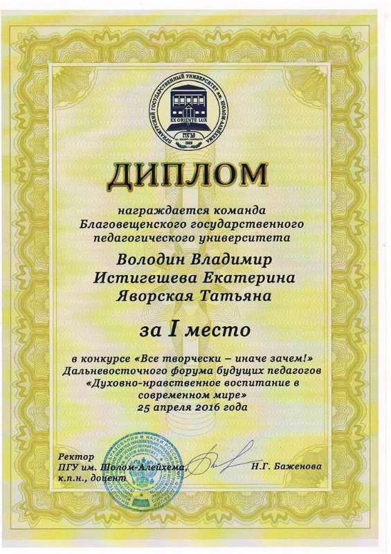Студенты Владимир Володин, Екатерина Истигешева, Татьяна Яворская, под руководством Анны Анатольевны Клецкиной, к.п.н., доцента кафедры педагогики и методики начального образования, заняли три первых места! I место по итогам всех конкурсов; I место в конкурсе "Нравственный подвиг учителя"; I место в конкурсе "Все творчески - иначе зачем!"; II место в конкурсе "Здравствуйте! Я - педагог!".