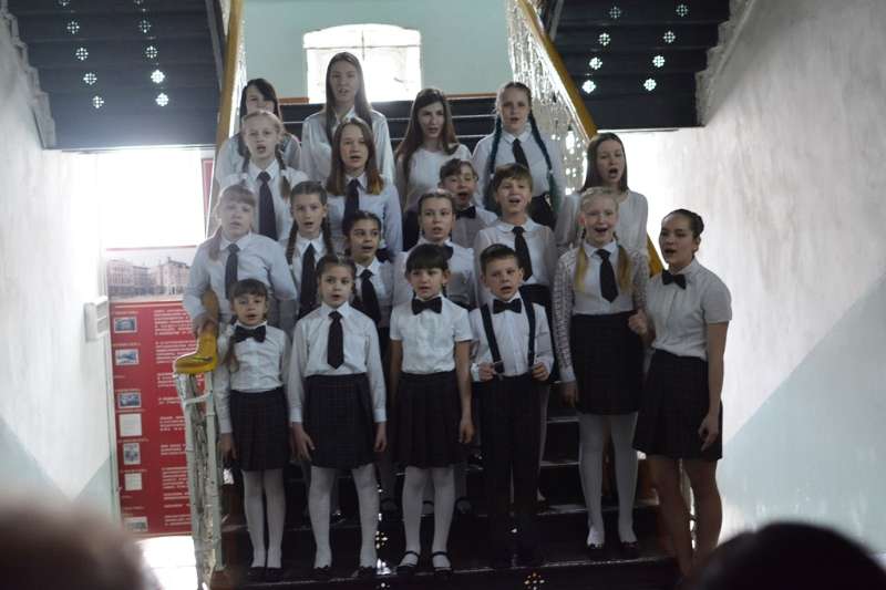 Перед началом концерта на втором этаже центральной лестницы выстроились солисты вокального ансамбля «Акварель» и встречали гостей песней «Выйду в поле с конем».
