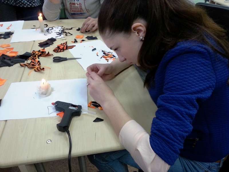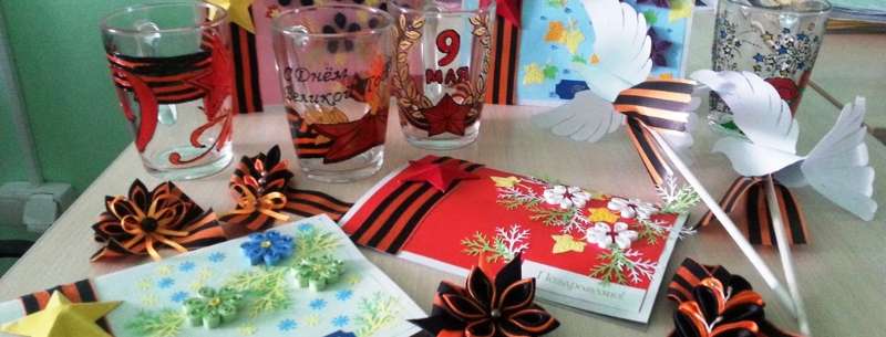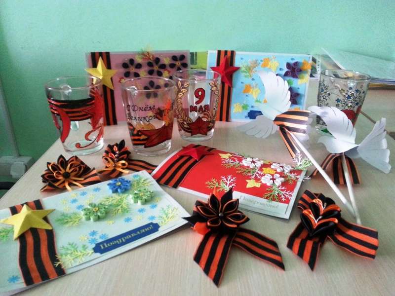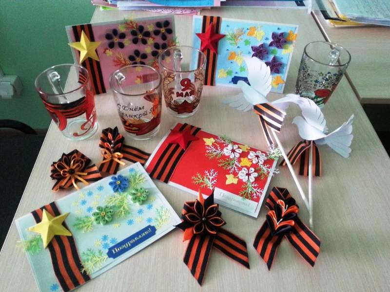 Ребята расписывали кружки, изготавливали георгиевские ленточки в технике канзаши и открытки в техниках квиллинг, изонить, а также другие сувениры в различных техниках.