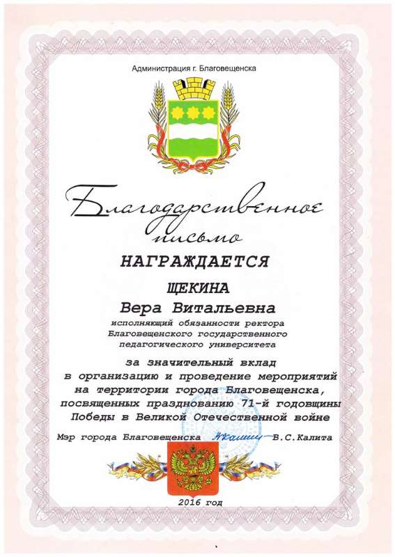 Заместитель мэра города Благовещенска по социальным вопросам Светлана Вячеславовна Яковлева наградила благодарственными письмами Веру Витальевну Щёкину, ректора БГПУ, Светлану Александровну Голубеву, начальника отдела по внеучебной работе, и Татьяну Петровну Канцедалову, специалиста ОВР, за значительный вклад в организацию и проведение мероприятий на территории города Благовещенска, посвященных празднованию Великой Победы.