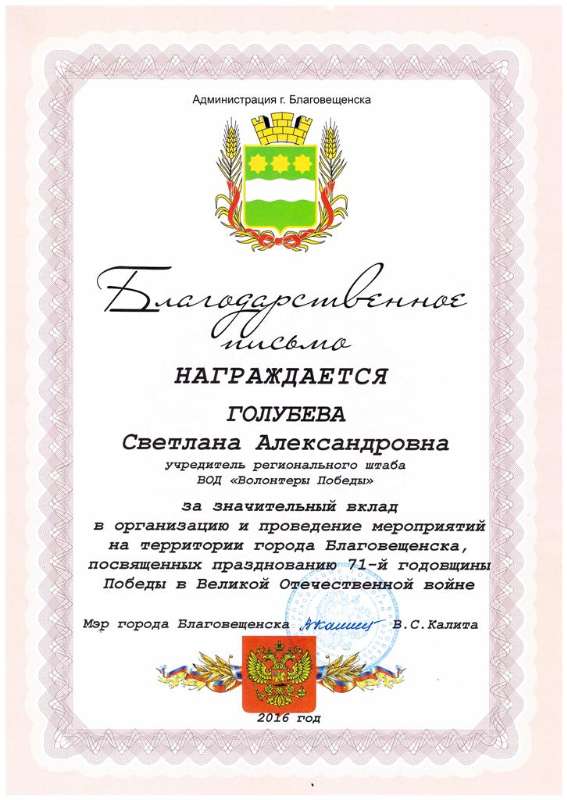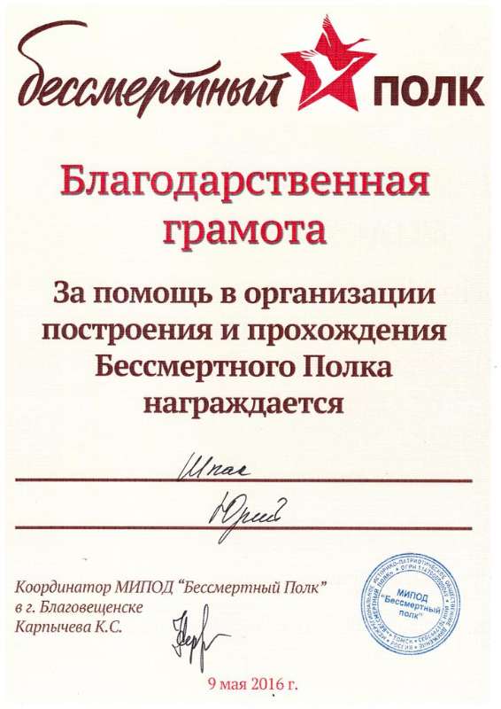 Юрий Шпак, Максим Голев, Светлана Борисенко, Юлия Продиус, Галина Новоселова, Владислав Семеров, Мария Довбня получили благодарственные письма за помощь в организации построения и прохождения Бессмертного полка от координатора МИПОД «Бессмертный полк» в г. Благовещенске К.С. Карпычевой.