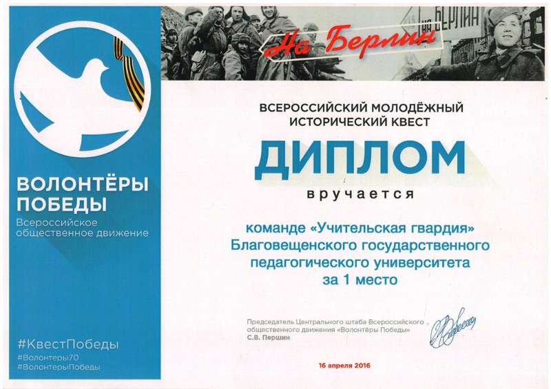 Команда «Учительская гвардия» (студенты ИФФ, ППФ, ФФКиС) была награждена благодарностью от председателя Центрального штаба Всероссийского общественного движения «Волонтеры Победы» С.В. Першина за победу во Всероссийском молодежном историческом квесте «На Берлин», а за организацию этого мероприятия в Благовещенске от БГПУ награждены Милютина Николаева, Алина Болотникова, Алина Новикова.