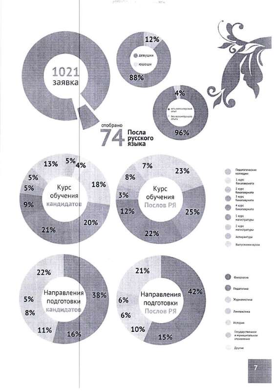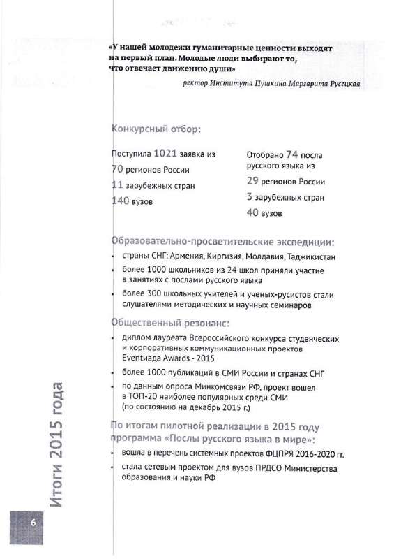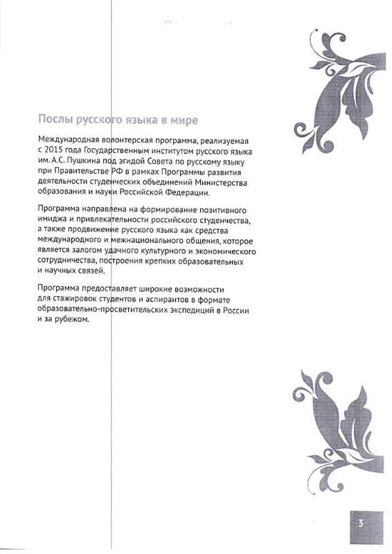 «Послы русского языка в мире» - молодежная волонтерская программа, популяризирующая русский язык, культуру и литературу в России и за рубежом. Также одна из целей программы – развитие и укрепление межвузовских и международных партнерских связей, организация диалога культур. В программе примут участие будущие филологи, педагоги, литераторы, историки, журналисты, а также студенты других гуманитарных и творческих направлений.