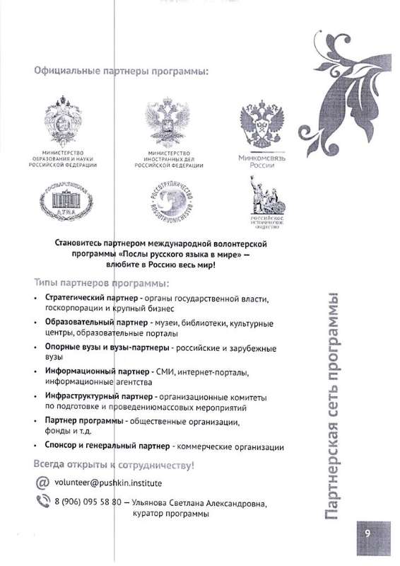 Куратор программы «Послы русского языка в мире»: Ульянова Светлана Александровна, тел. +7 (906) 095 58 80, адрес электронной почты: svetlane@bk.ru.