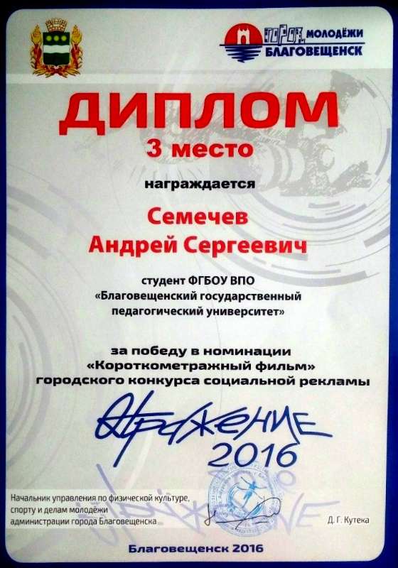 Андрей Семечев, студент ФМФ, подал заявки сразу по двум номинациям: «Короткометражный фильм» и «Социальная реклама». Его социальный ролик, мотивирующий заниматься спортом, вошел в число лучших работ 2016 года, но призовое место не занял, а вот за работу под названием "Темная сторона" на тему "Жизнь без вредных привычек" в номинации «Короткометражный фильм» Андрей награжден дипломом за III место.