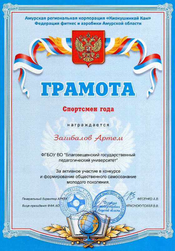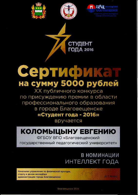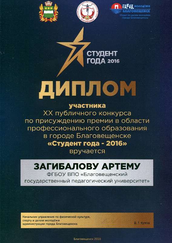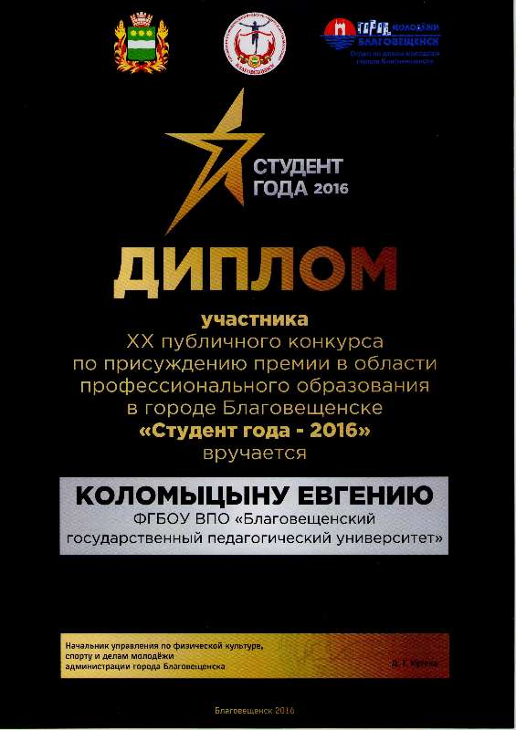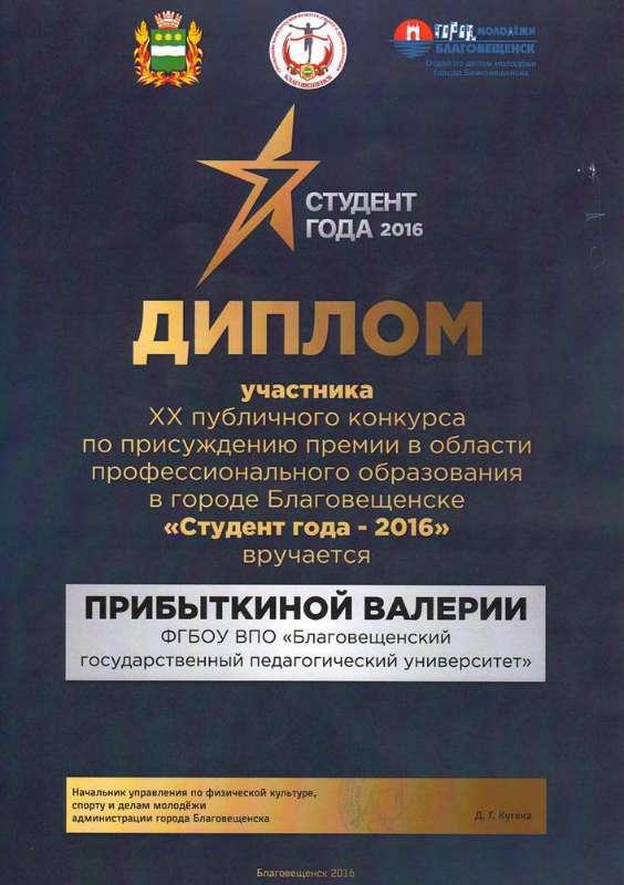 XX публичный конкурс по присуждению премии в области профессионального образования «Студент года-2016» прошел в городе Благовещенске. В номинации «Спортсмен года» БГПУ представлял Артем Загибалов, ФМФ, в номинации «Интеллект года» - Евгений Коломыцын, ФМФ, в номинации «Лидер студенческого самоуправления» - Валерия Прибыткина, ИФФ.