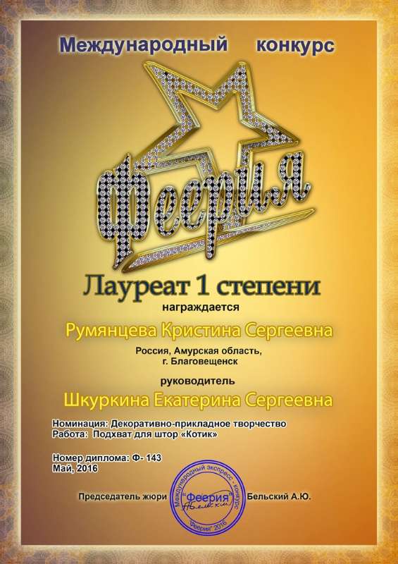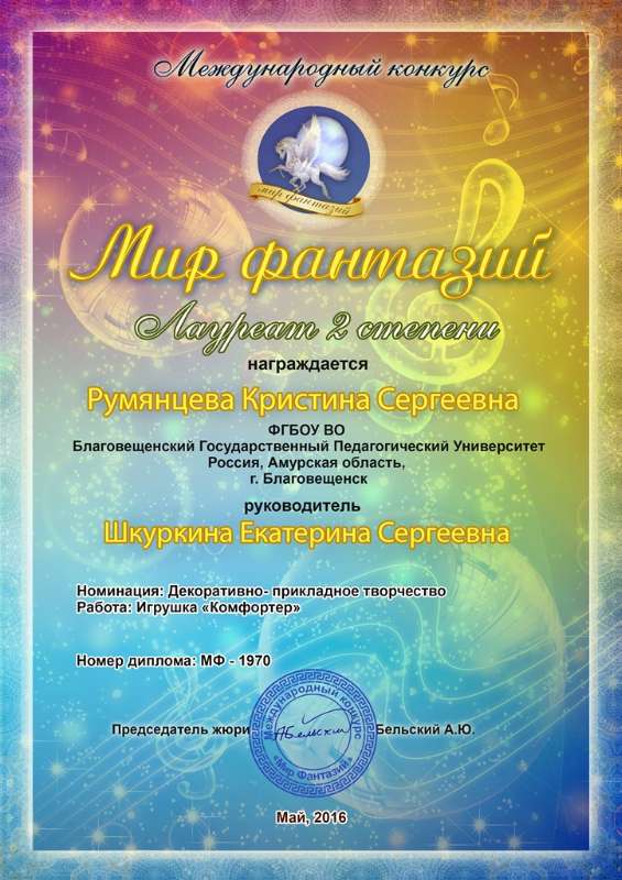 Кристиной Румянцевой под руководством Е.С. Шкуркиной было представлено две творческие работы. На конкурсе «Феерия» в номинации «Декоративно-прикладное творчество» (категория «Студент») за работу «Подхват для штор «Котик» Кристина награждена дипломом Лауреата I степени. В конкурсе «Мир фантазии» в номинации «Декоративно-прикладное творчество» студентка заявила «Игрушку «Комфортер», которая была отмечена дипломом Лауреата II степени.