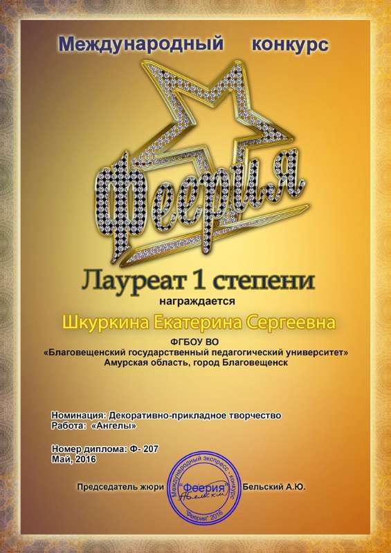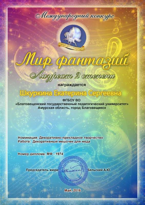 Е.С. Шкуркиной было представлено три работы в разных декоративно-прикладных техниках. В конкурсе «Феерия» в номинации «Декоративно-прикладное творчество» за работу «Ангелы» она стала Лауреатом I степени и Лауреатом II степени за работу «Подарочный конверт в технике «вытынанка»; в конкурсе «Мир фантазии» в номинации «Декоративно-прикладное творчество» диплом Лауреата II степени Екатерина Сергеевна получила за работу «Декоративный мешочек для меда».