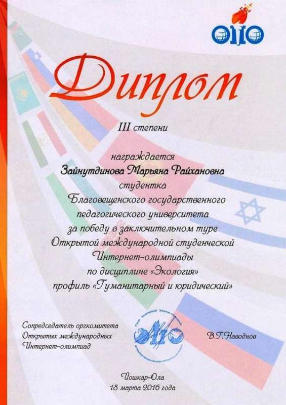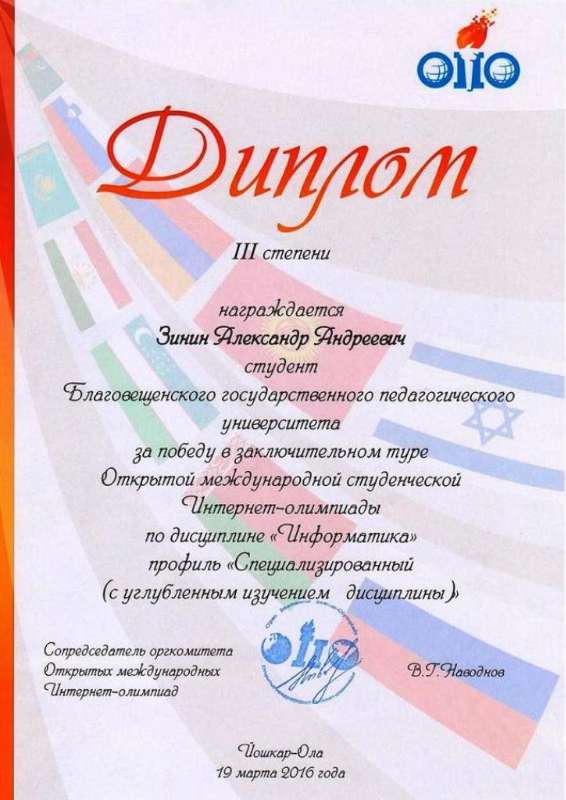 Дипломами и бронзовыми медалями за победу в заключительном туре Открытой международной студенческой Интернет-олимпиады награждены: Александр Зинин, студент ФМФ, (по дисциплине "Информатика", профиль "Специализированный"), Виктор Лизандер, студент ЕГФ, (по дисциплине "Химия", профиль "Специализированный") и Марьяна Зайнутдинова, студентка ЕГФ, (по дисциплине "Экология", профиль "Гуманитарный и юридический").