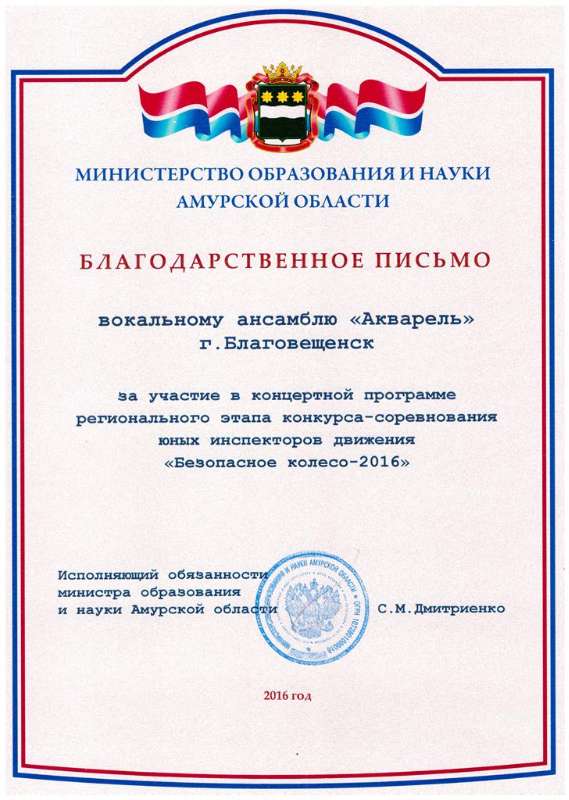 Благодарственное письмо Министерства образования и науки Амурской области за высокий уровень организации участия детей в концертной программе регионального этапа конкурса-соревнования юных инспекторов движения "Безопасное колесо - 2016" награждена Марина Горбачева, руководитель вокального ансамбля "Акварель".