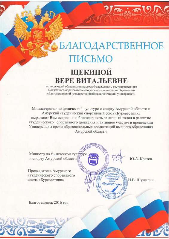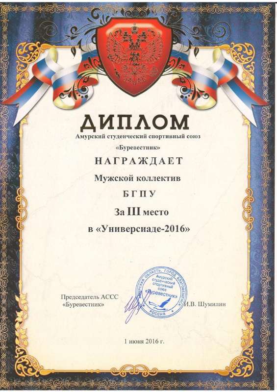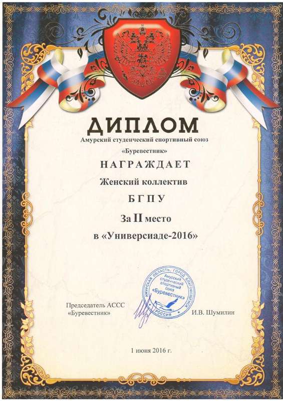 Председатель Амурского студенческого спортивного союза "Буревесник" И.В. Шумилин вручил ректору БГПУ Вере Витальевне Щёкиной благодарственное письмо Министерства по физической культуре и спорту Амурской области за личный вклад в развитие студенческого спортивного движения и активное участие в проведении Универсиады среди образовательных организаций высшего образования Амурской области. За участие в "Универсиаде - 2016" дипломом II степени и кубком награжден женский коллектив БГПУ, дипломом III степени и кубком - мужской коллектив университета.