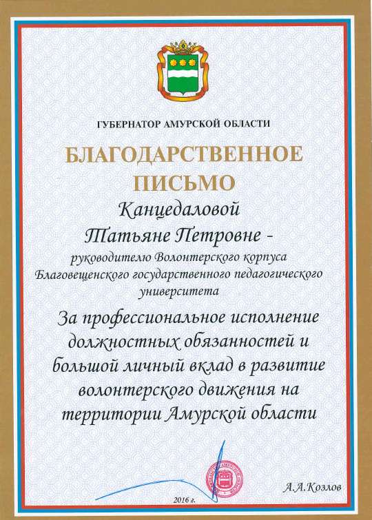 На встрече организаторы и участники подвели итоги работы Корпуса добровольцев Благовещенска, выделили самые значимые мероприятия, а также получили благодарность мэра города Благовещенска за проделанную работу. Затем В.С. Калита и О.А. Косолапов, заместитель мэра города Благовещенска, ответили на вопросы активистов, которые касались перспектив развития волонтерского движения в городе. Завершилась встреча награждением благодарственными письмами от губернатора Амурской области А.А. Козлова, одно из которых получила и Т.П. Канцедалова как руководитель Волонтерского корпуса БГПУ.