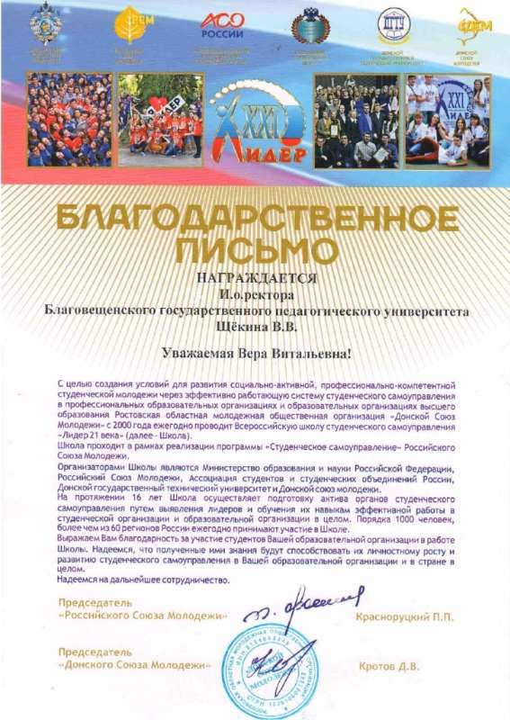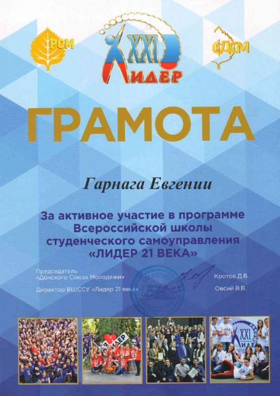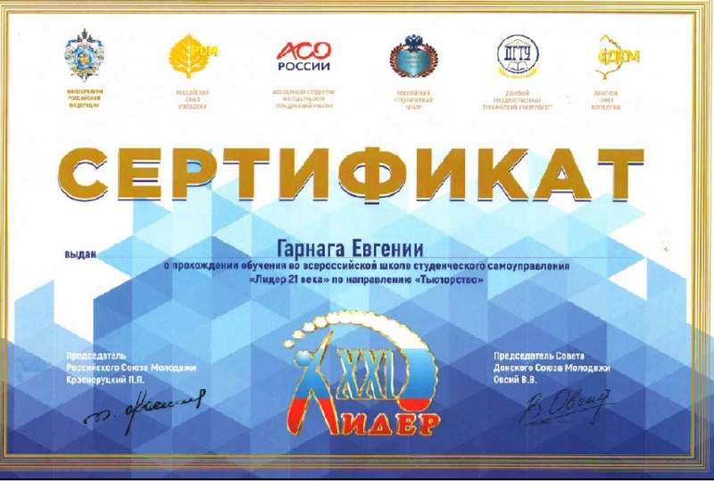 С 1 по 6 августа в Ростов-на-Дону прошла 71 ВШССУ «Лидер 21 века», в которой приняла участие студентка 2 курса психолого-педагогического факультета Евгения Гарнага. В мае Евгения участвовала в отборочном туре школы - заочном конкурсе проектов в сфере организации деятельности органов студенческого самоуправления по направлению «Лучший проект в сфере тьюторства». Проект «Тест-драйв в Педагогическом» (руководитель – М.В. Воронина, специалист центра профориентации и трудоустройства выпускников) успешно прошел заочный этап и Евгению пригласили на очный этап конкурса, организованный в рамках ВШССУ.
