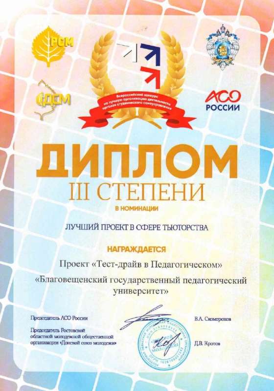 Евгения прошла подготовку по теме «Адаптация первокурсников к обучению в вузе», в рамках которой рассматривались вопросы работы студентов-тьюторов (общественных кураторов) из числа старшекурсников с вновь поступившими. Также по результатам очного этапа конкурса проект «Тест-драйв в Педагогическом» был отмечен экспертами и занял III призовое место.
