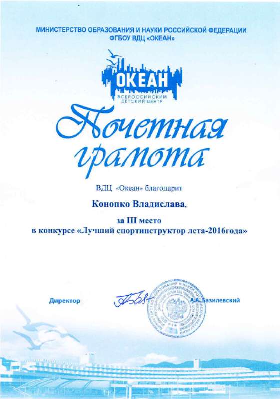 Студенты вузов Владивостока, Уссурийска, Хабаровска, Благовещенска, Абакана, Иркутска, Новосибирска, Оренбурга и Москвы приняли участие в конкурсе «Лучший спортивный инструктор», проводимого в течение всех смен ВДЦ «Океан». По итогам конкурса студент 4 курса факультета физической культуры и спорта БГПУ Владислав Конопко занял третье место. Поздравляем!