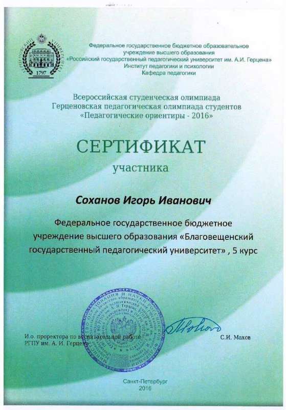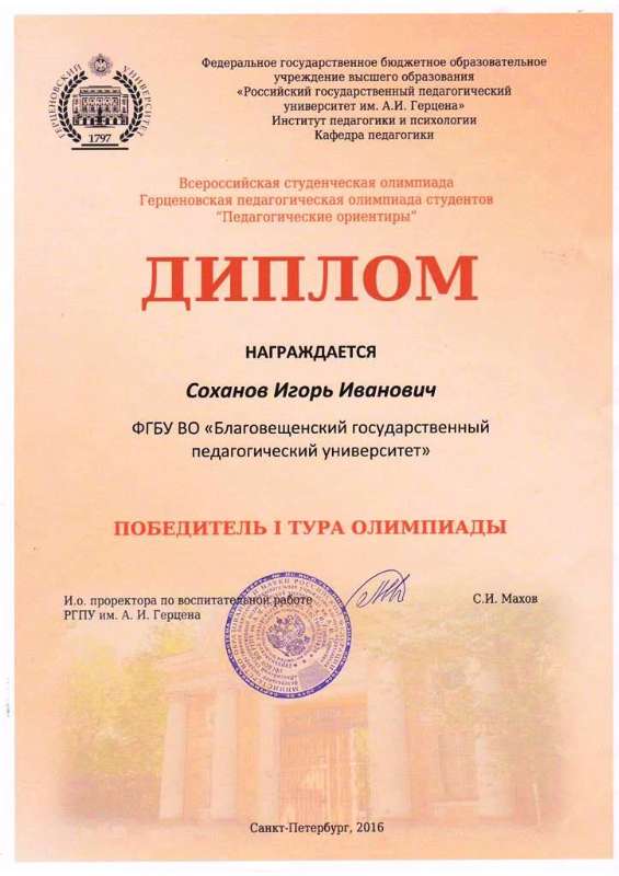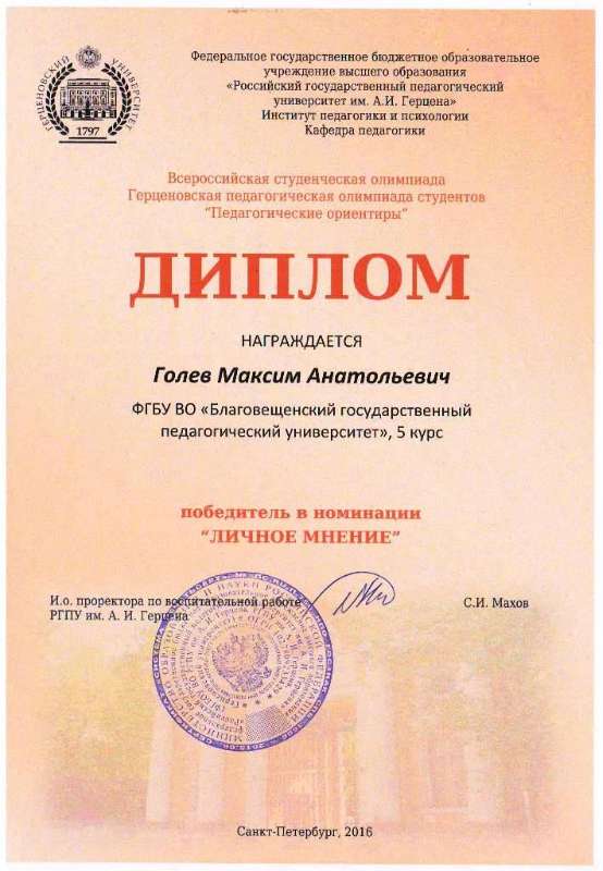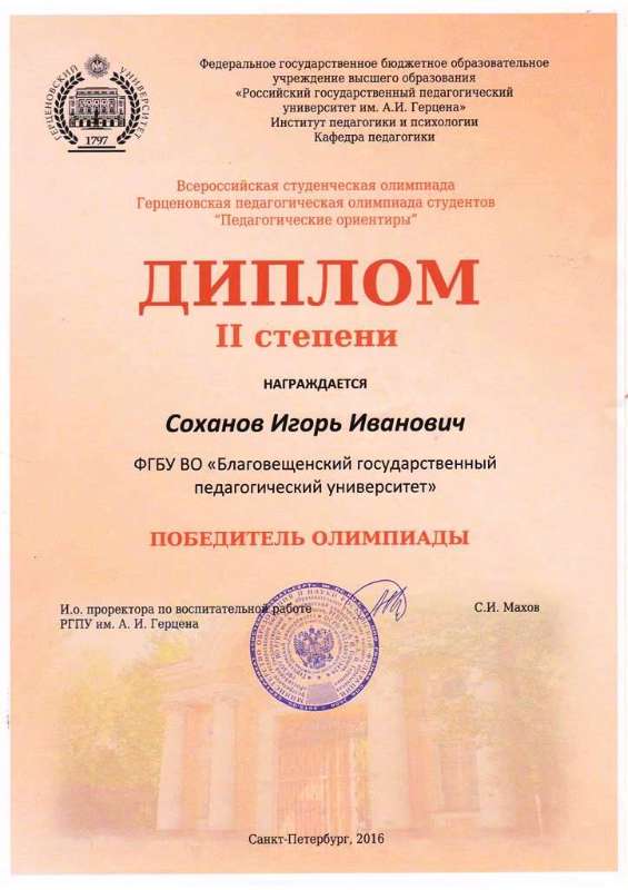 По итогам Олимпиады победителями в номинациях «Личное мнение» и «Профессиональный маршрут педагога» стали Максим Голев и Евгения Гарнага, а победителем олимпиады и обладателем диплома II степени - Игорь Соханов.