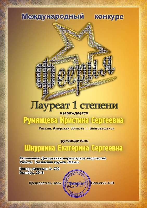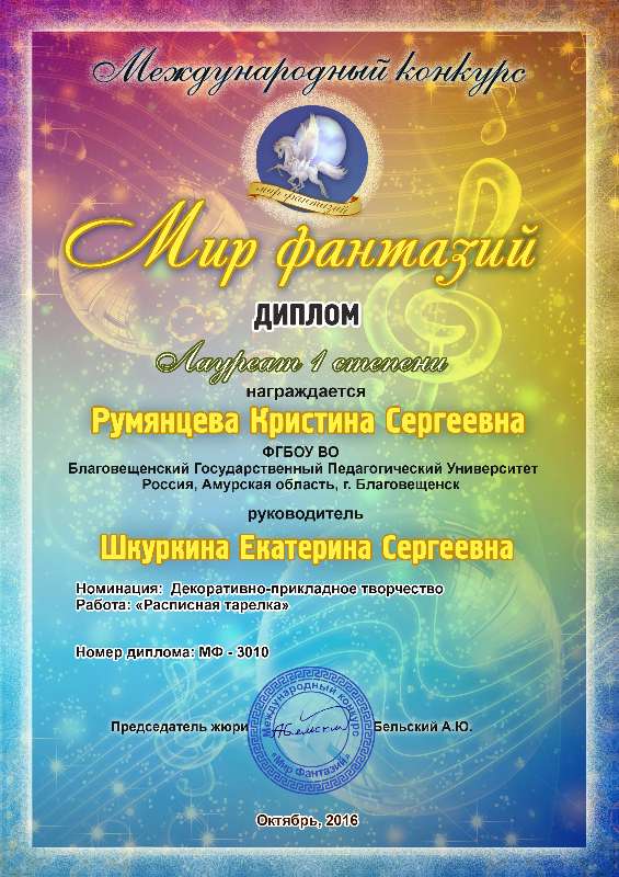 Кристина Румянцева, студентка 5 курса индустриально-педагогического факультета, слушатель ОДПП «Прикладные искусства», приняла участие в Международных заочных конкурсах «Мир фантазий» и «Феерия».