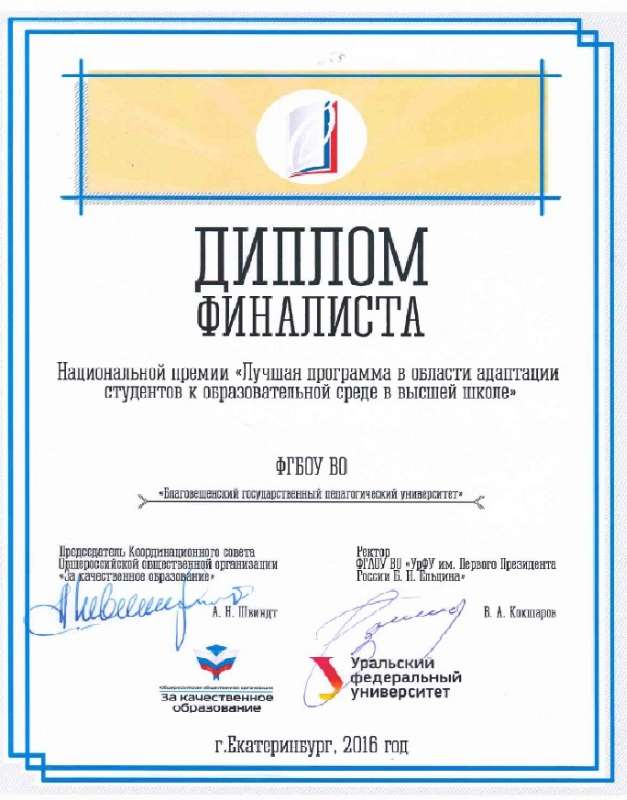 В рамках данного форума прошел очный этап Национальной премии в области качества образования, в котором была представлена видео-работа студенческой комиссии по качеству образования БГПУ к номинации «Лучшее мотивирующее видео» (ранее видео прошло отбор на заочном этапе). По итогам конкурса команда БГПУ была награждена дипломом финалиста. Заочный этап успешно прошла программа адаптации студентов 1 курса БГПУ, реализуемая с 2009 года. На очном этапе Национальной премии «Лучшая программа в области адаптации студентов к образовательной среде в высшей школе» программу БГПУ презентовала Воронина М.В., старший преподаватель кафедры педагогики, которая также была отмечена дипломом финалиста премии.