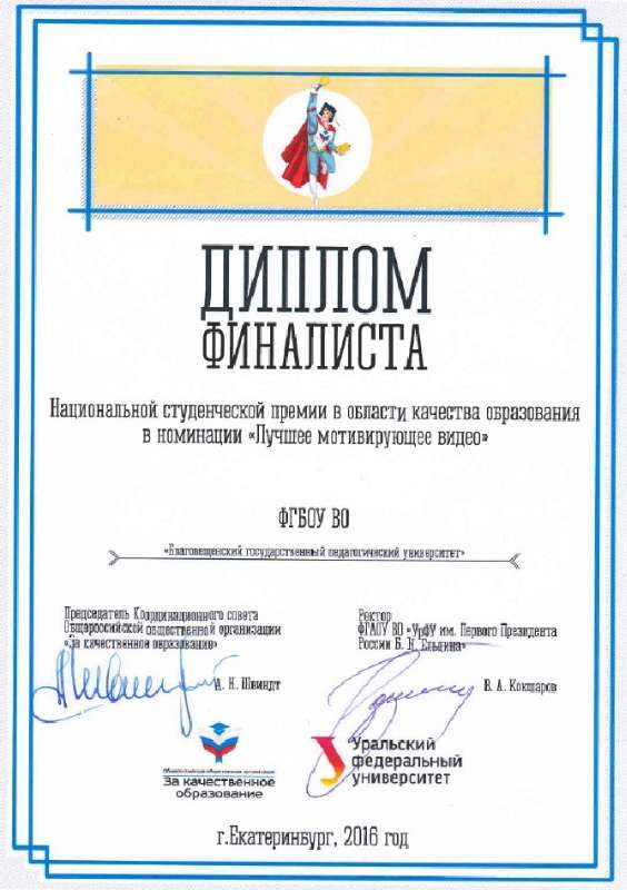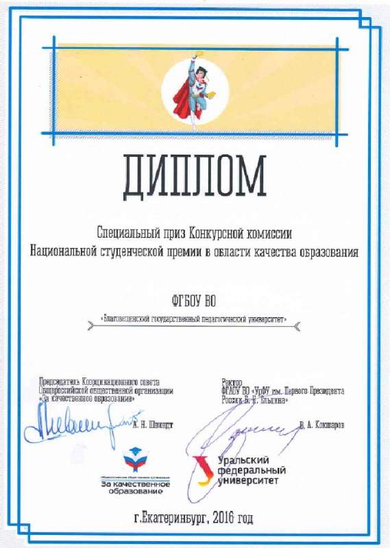По итогам работы Форума организаторы (Общероссийская общественная организация «За качественное образование» и Союз студентов УрФУ) учредили специальный приз студенческой комиссии по качеству БГПУ (представитель на форуме и председатель комиссии студентка 2 курса ЕГФ – Алина Новикова).