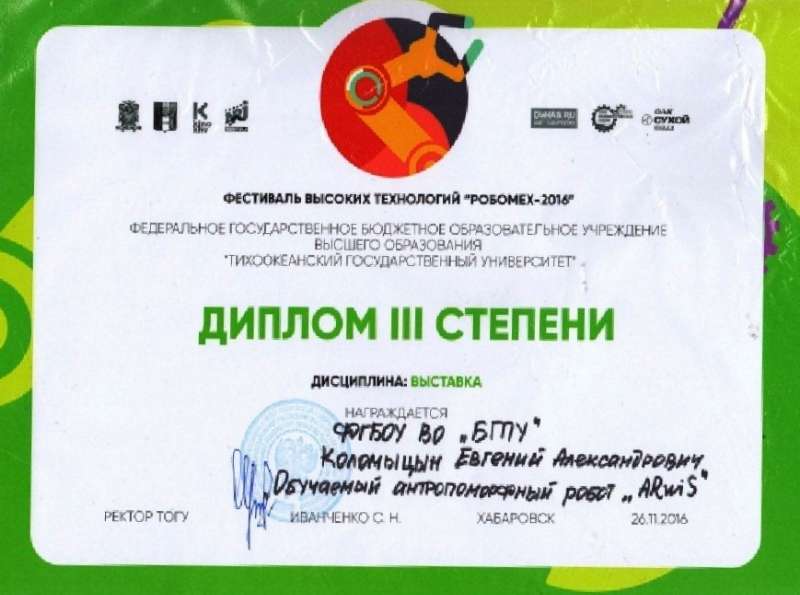 Кроме того, Евгения Коломыцына наградили специальным призом от комитета по молодежной политике Правительства Хабаровского края за разработанный им экспонат «Обучаемый антропоморфный робот «Arwis».