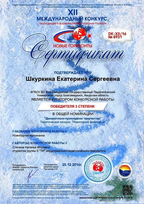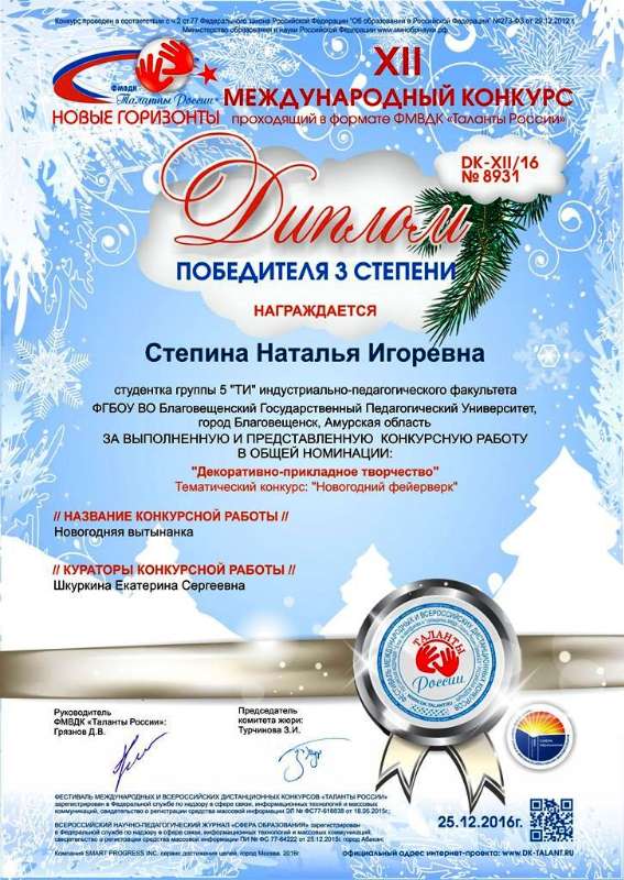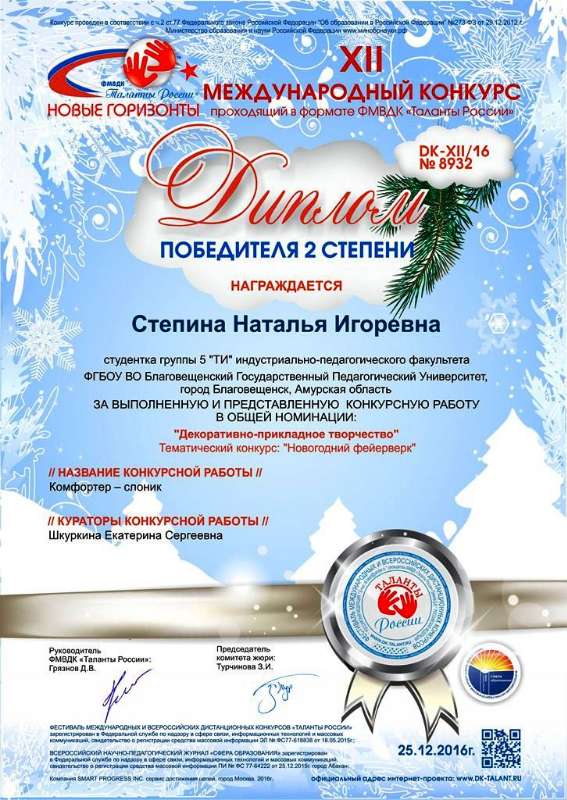 Студентка 5 курса индустриально-педагогического факультета, слушатель ОДПП «Прикладное искусство» Степина Наталья приняла участие в ХII Международном конкурсе «Таланты России. Новые горизонты», г. Москва. За выполненную и представленную конкурсную работу «Игрушка комфортер-слоник» в общей номинации «Декоративно-прикладное творчество», тематическом конкурсе «Новогодний фейерверк» она получила диплом II степени. А за работу «Новогодняя вытынанка» - диплом III степени в этой же номинации. Куратором конкурсных работ являлась Шкуркина Екатерина Сергеевна, старший преподаватель кафедры экономики, управления и технологии, руководитель ОДПП «Прикладное искусство».