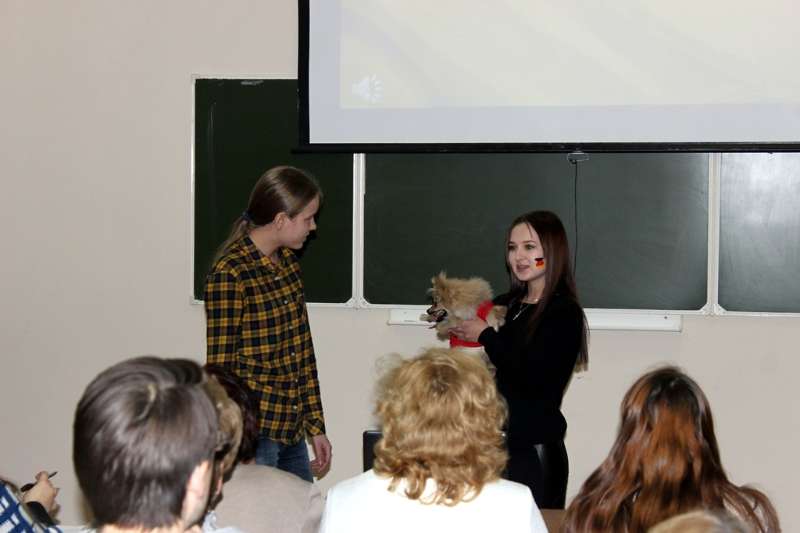 Первый след привел их к первокурснице, у которой живёт миниатюрная собачка немецкой породы шпиц. Благодаря своему острому обонянию шпиц «помог» первокурсникам обнаружить в нашем городе множество немецких товаров – автомобили, технику, шоколад, косметику, лекарства, колбаски, «Adidas». Всё это они перечисляли в своей ритмичной песне, удлиняя каждый новый куплет на одну строчку и в припеве снова упоминая шпица. На экране в это время мелькали фотографии немецкой продукции, сделанные студентами в магазинах города. Несколько строк в этой песенке первокурсники посвятили немецкому лектору фонда Бош Феликсу Кремеру, с которым познакомились на занятиях Немецкого клуба, а также всем германистам, изучавшим и изучающим немецкий язык в БГПУ.