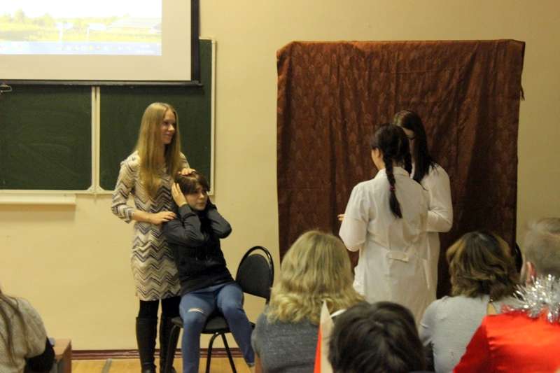 Второкурсники показали ироничную сценку о школьнике, который, оставшись один дома, не захотел делать домашнее задание, а решил посмотреть фильм. Но фильм оказался про «кровожадных» врачей, прописавших девушке немецкие лекарства, которые нужно было принимать только в строгой последовательности. Однако она (по русскому обычаю) принимала их неправильно и не получила желаемый результат. Фильм так напугал школьника, что мама решила показать его врачу. Нужно ли говорить, как он отреагировал на это, испугавшись еще больше и клятвенно пообещав маме всегда ходить в школу и выполнять домашние задания.