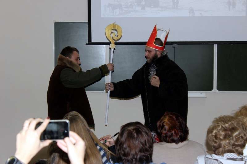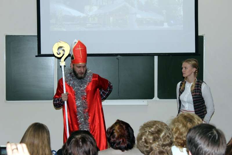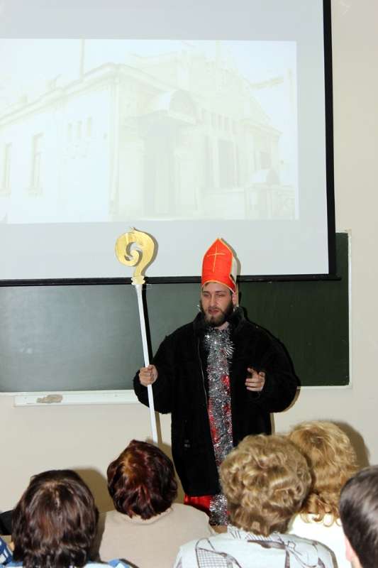 Выступление пятикурсников запомнилось тем, что публике неожиданно явился сам Святой Николай в традиционном епископском одеянии. С помощью эльфа он отправился на своей машине времени в далёкое прошлое и попал аж на край света – в наш Благовещенск 1858 года. Там его радушно встретил простой русский мужик, подарил ему тёплую зимнюю шубу, согрел его и показал ему город. Удивившись, что в Благовещенске ещё нет ни гимназии, ни библиотеки, ни универмага, Святой Николай сотворил чудо и подарил их городу. Он рассказал о том, что эти и многие другие учреждения в скором будущем возникнут благодаря деятельности немецких градоначальников, предпринимателей, общественных деятелей, архитекторов и инженеров немецкого происхождения, а также о том, какие учреждения будут находиться в этих зданиях век спустя. И действительно, на старинных фотографиях на экране поочередно возникали реальные свидетельства тех времён: Дом военного губернатора, здания мужской и женской гимназий, казарм и домов военного ведомства, казначейства, торгового дома «Кунст и Альберс» и другие исторические достопримечательности Благовещенска.