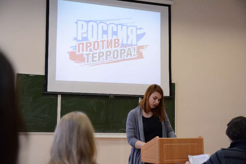Ребята вспомнили жертв терактов, которые произошли в России, и отметили, что сегодня в нашей стране существует общегосударственная система противодействия терроризму, разработано антитеррористическое законодательство. Зашел разговор о том, что Россия имеет большой опыт борьбы с терроризмом, сотрудничает с международным сообществом по этому направлению. Первокурсники подготовили доклад и мультимедийную презентацию о памятниках жертвам терроризма в мире.