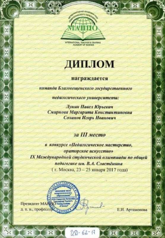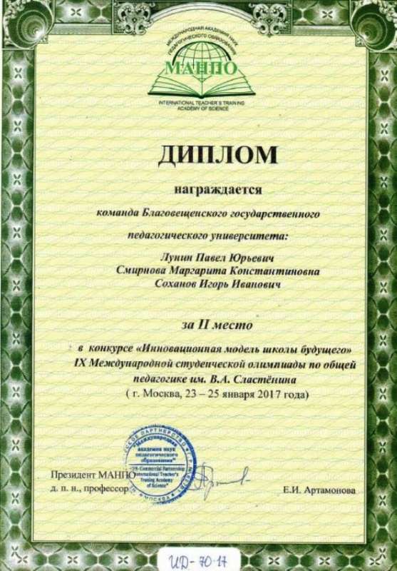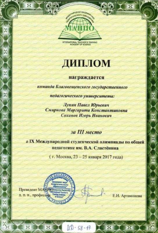 В начале 2017 года копилка педагогических достижений студентов БГПУ пополнилась значительными результатами. 23-25 января на базе Московского государственного областного университета прошла IХ Международная студенческая олимпиада по педагогике им. В.А. Сластёнина, организуемая Международной академией наук педагогического образования (МАНПО). Наш вуз представляла команда в составе Смирновой Маргариты (ППФ), Соханова Игоря (ФМФ) и Лунина Павла (ФФКиС), под руководством заведующей кафедрой педагогики Надежды Валентиновны Карнаух.