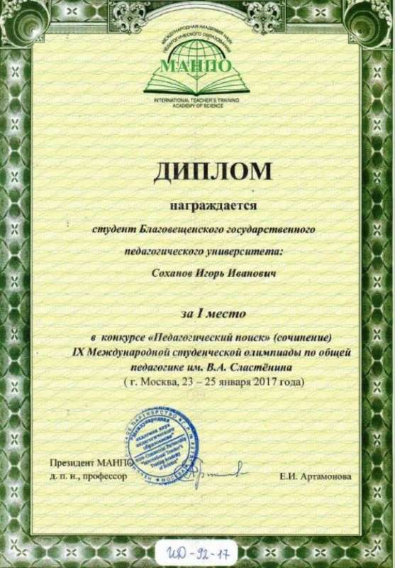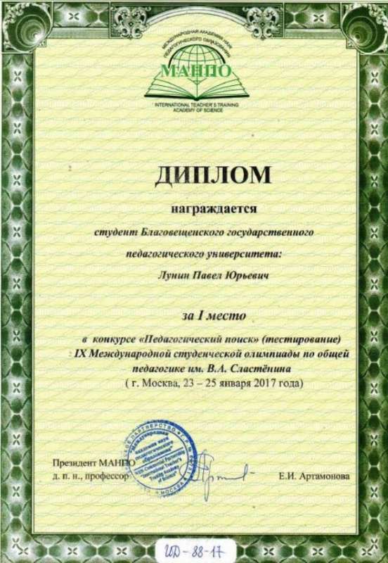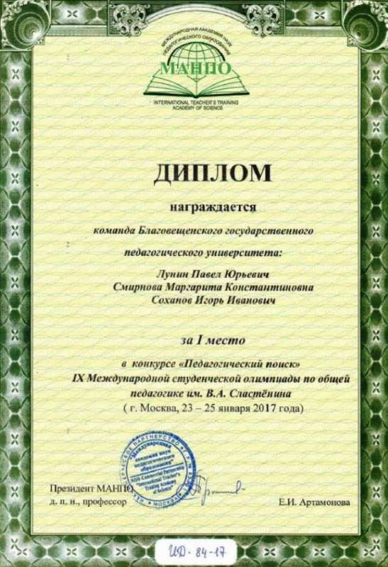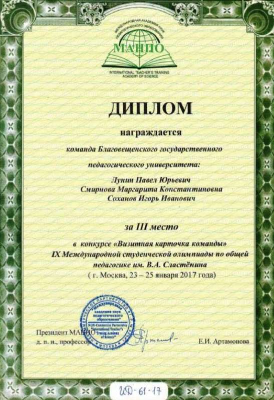 По результатам девяти конкурсных номинаций команда БГПУ заняла I место в теоретическом конкурсе «Педагогический поиск» (было представлено три вида заданий: тестирование – П.Лунин, сочинение по опорным терминам – И. Соханов, решение педагогических задач – М. Смирнова). Во всех видах работы наших ребят стали лучшими, за что студенты награждены медалями МАНПО.