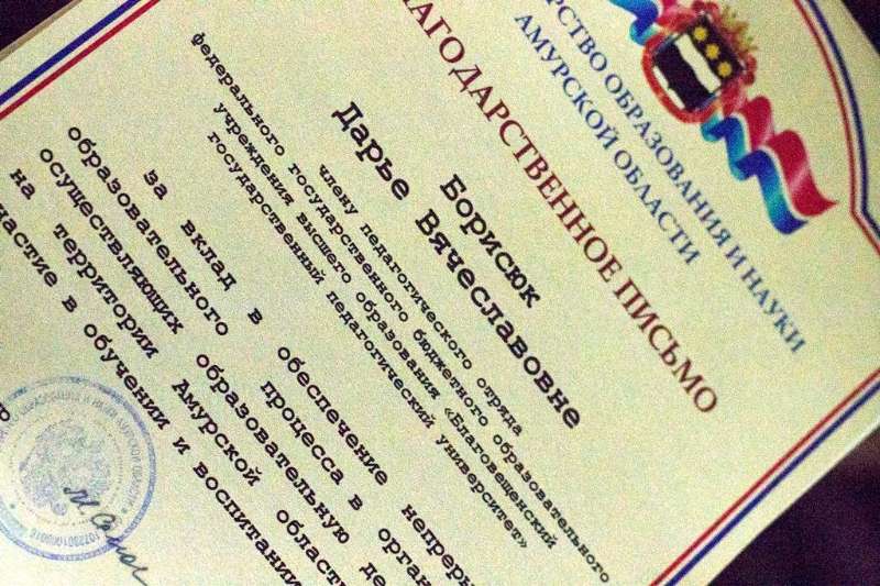 Кроме того, 37 студентов и 2 координатора деятельности профильного педагогического отряда награждены Благодарственными письмами от министерства образования и науки Амурской области.