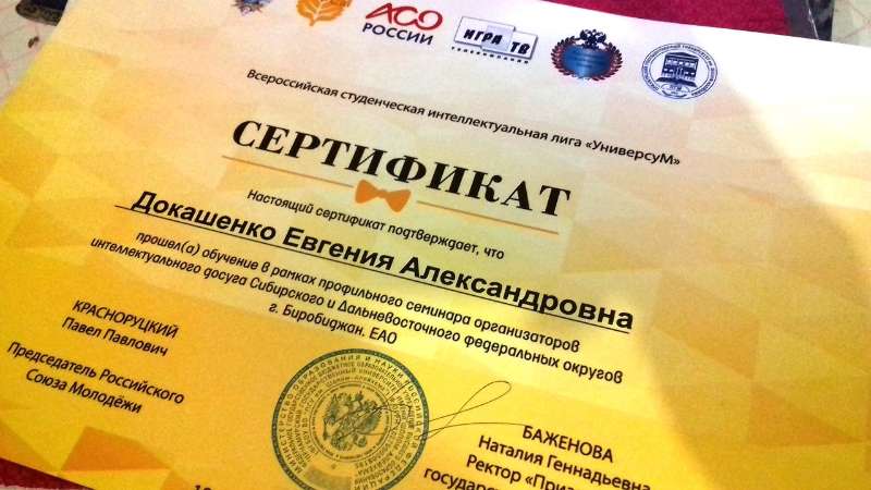 19-21 апреля 2017 года студенты БГПУ Докашенко Евгения (ФМФ) и Бойко Алина (ИПФ) приняли участие в семинаре организаторов интеллектуального досуга для студентов образовательных учреждений Сибирского и Дальневосточного федеральных округов. Организаторы семинара - Приамурский государственный университет имени Шолом-Алейхема и Общероссийская общественная организация «Российский Союз Молодежи».